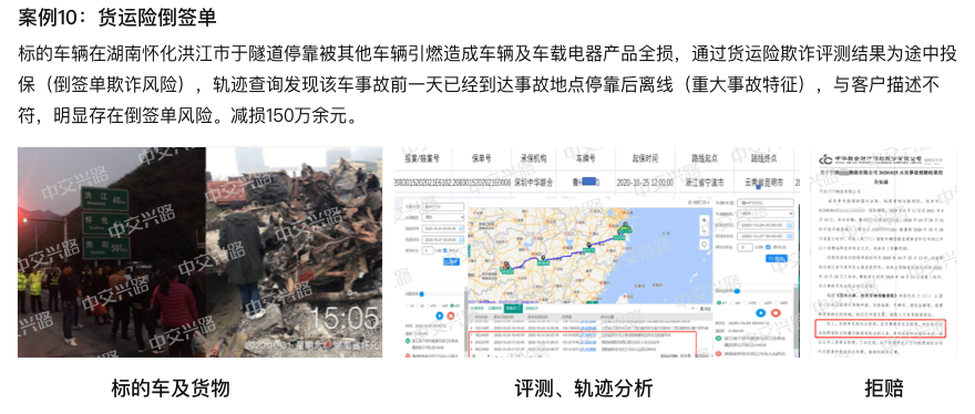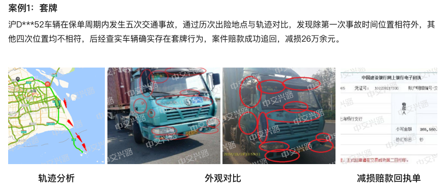 全国货运公共平台720万+辆重载货车实时监控,通过轨迹查询、欺诈评测等理赔风险识别工具,还原事故真相,准确识别欺诈风险,为险企货车承保经营降本增效,实现理赔效率和成本管控的双提升。